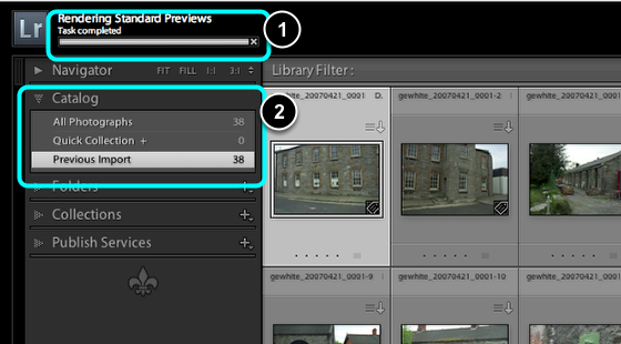 Previews of each file are then rendered and saved to the catalog. The rate of progress is visible in the Progress Bar (1).