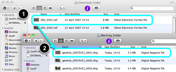 If you open both folders you will notice there are now two sets of identical image files. (1) contains the original camera files, the second contains the same files only converted to DNG Raw. The DNG files will also have any added metadata which you applied during import such as IPTC Creator and Copyright data.